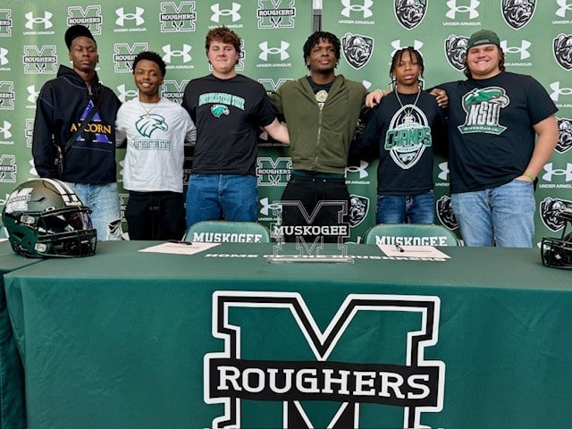 Six Muskogee Rougher footballers signed college letters of intent recently in a ceremony at Rougher Village to continue their football careers at the next level.